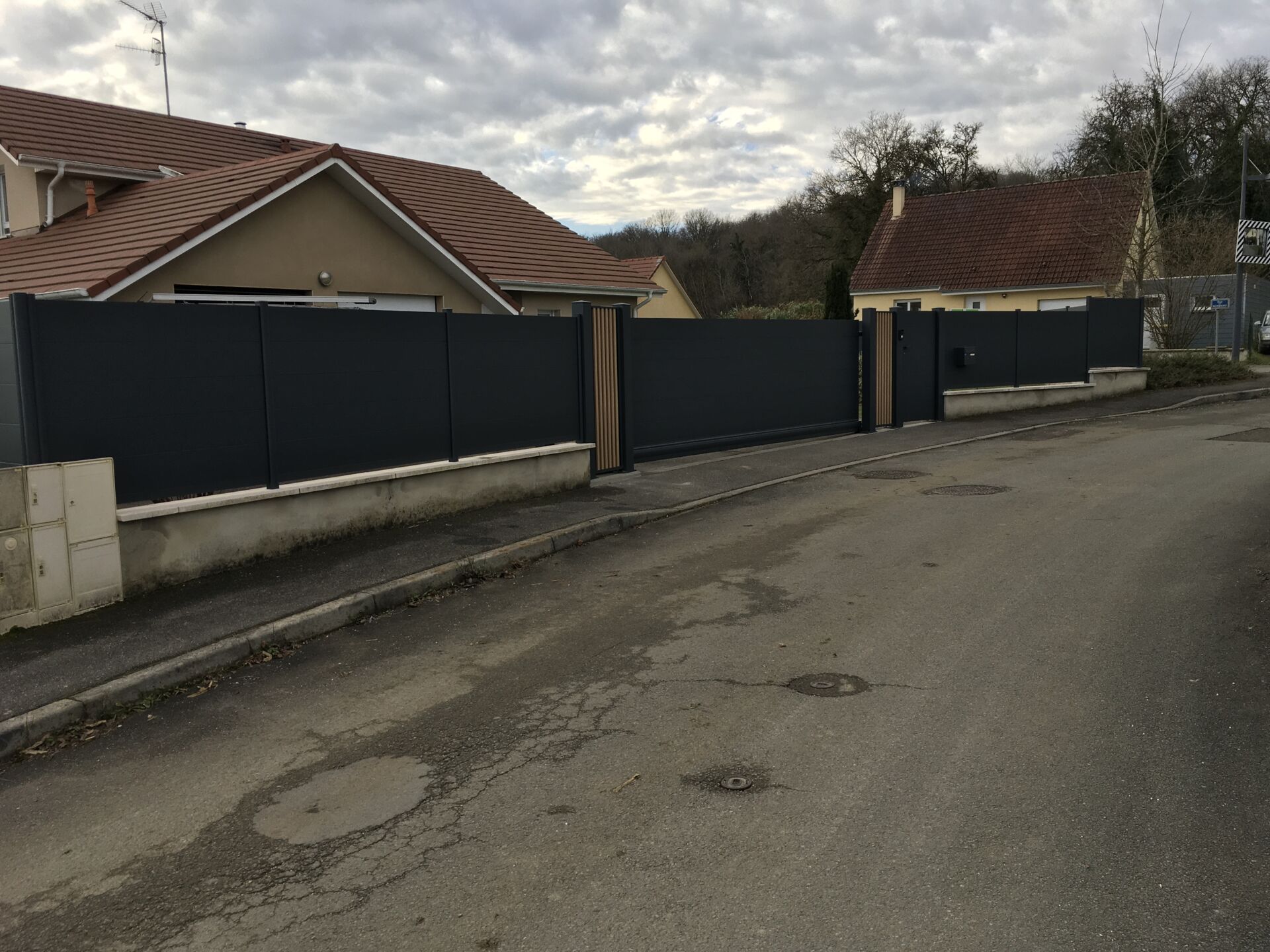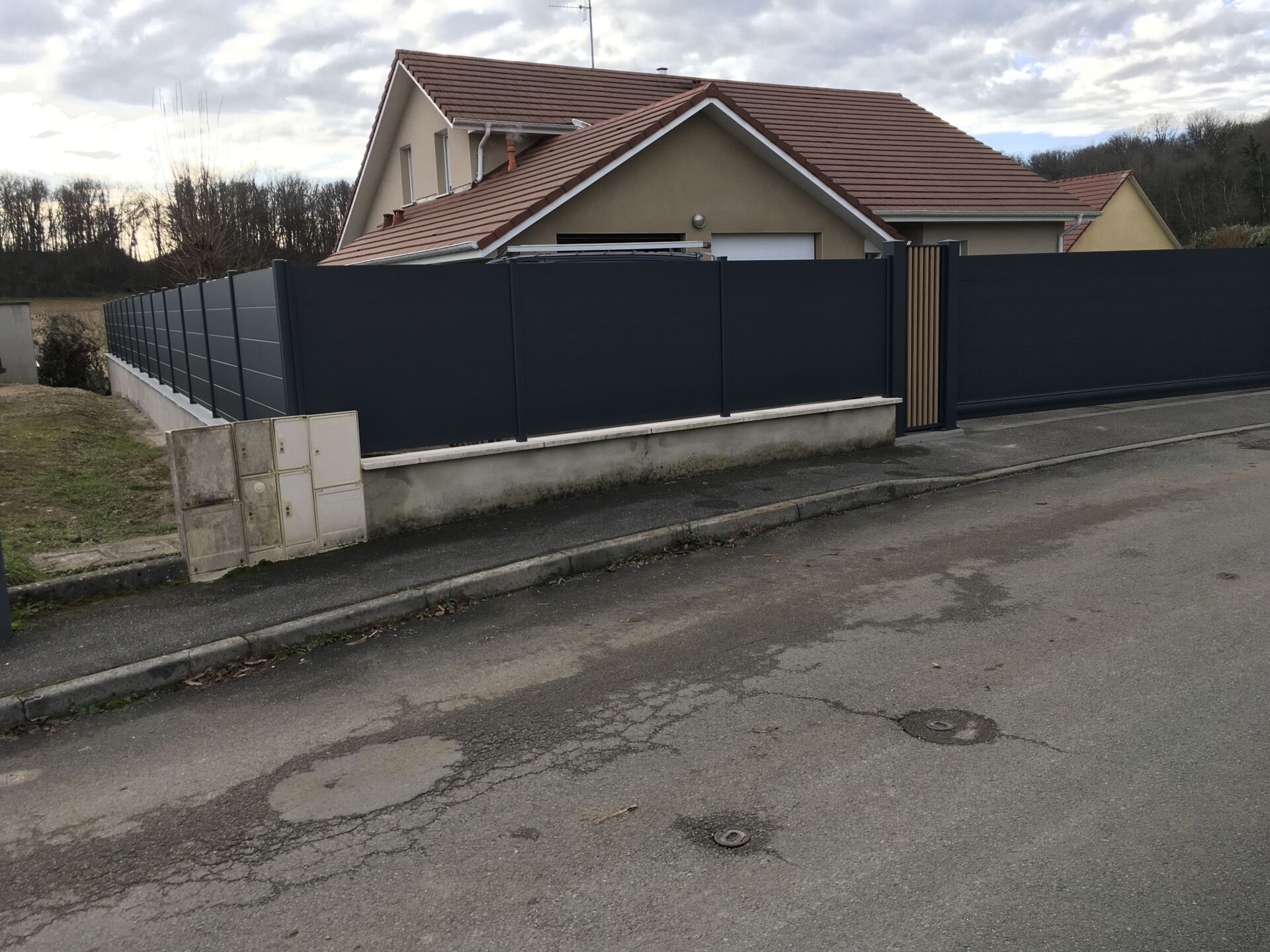 La clôture assortie, posée sur maçonnerie par poteaux carottés, intègre une boîte aux lettres pour un rendu esthétique et fonctionnel.