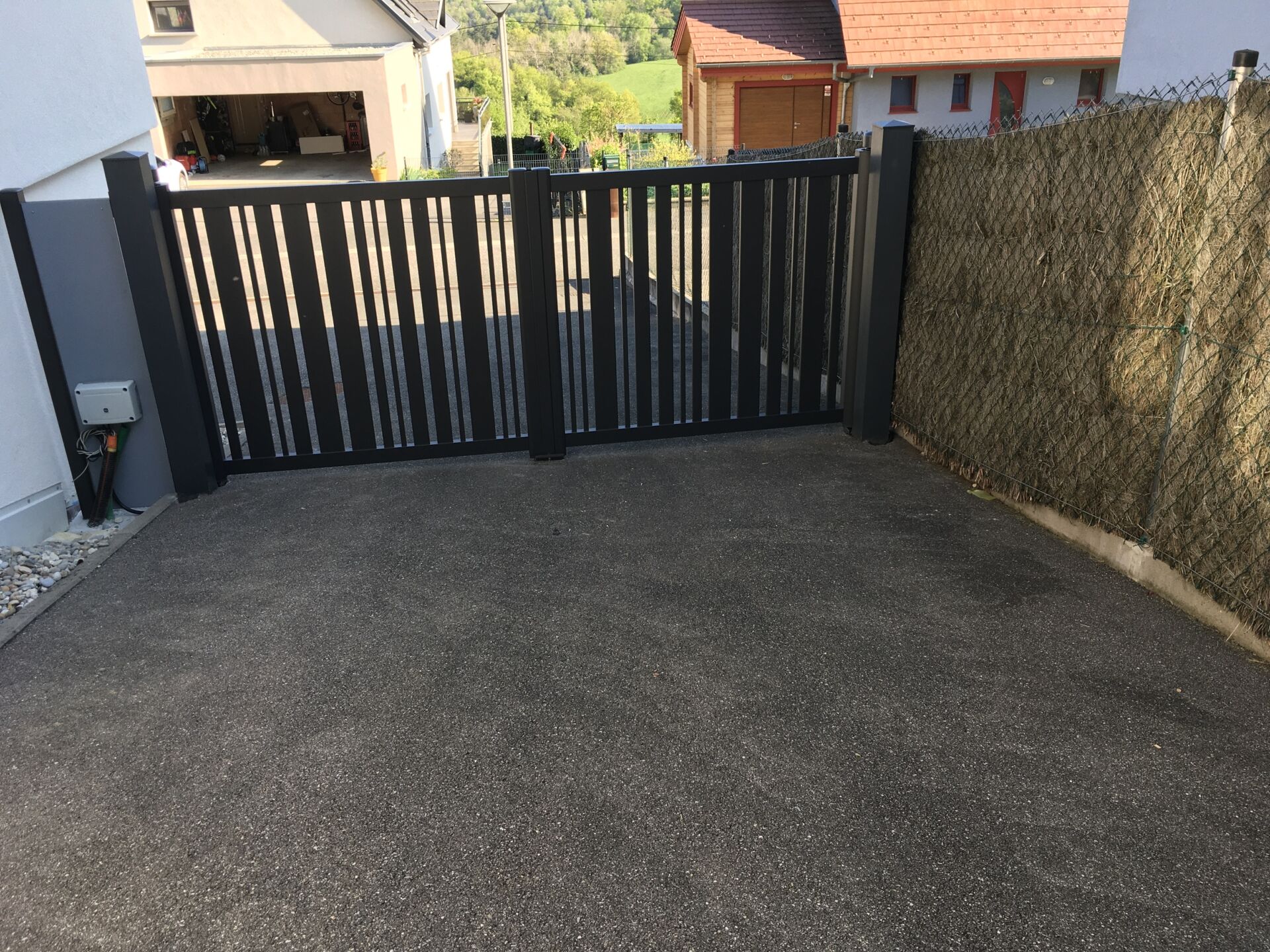 Le portail motorisé assure un confort d’utilisation optimal, tandis que le portillon coordonné facilite l’accès piéton au quotidien.