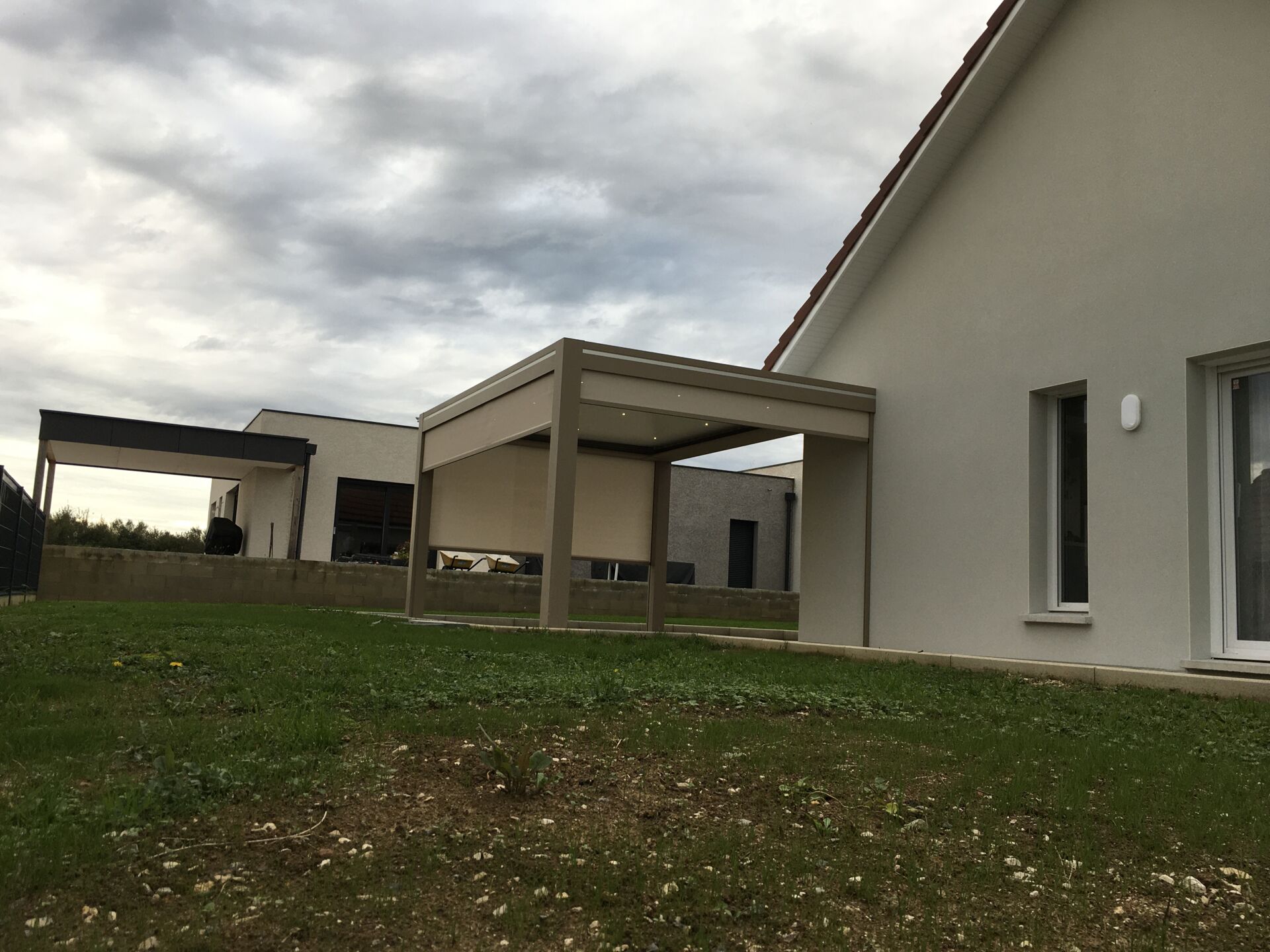SB Concept a réalisé à Grandvillars, près de Montbéliard, une élégante pergola bioclimatique aluminium beige, attenante et légèrement débordante à la maison.
