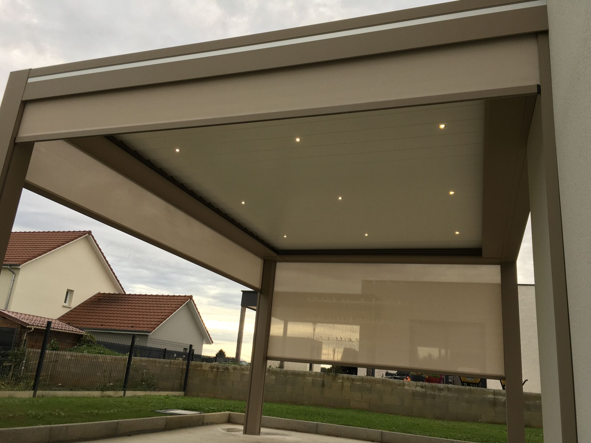 La pergola est équipée de trois stores enroulables motorisés Somfy, pour un contrôle optimal de l’ombre et de l’intimité, ainsi que d’un éclairage intégré dans les lames pour prolonger les soirées en extérieur.